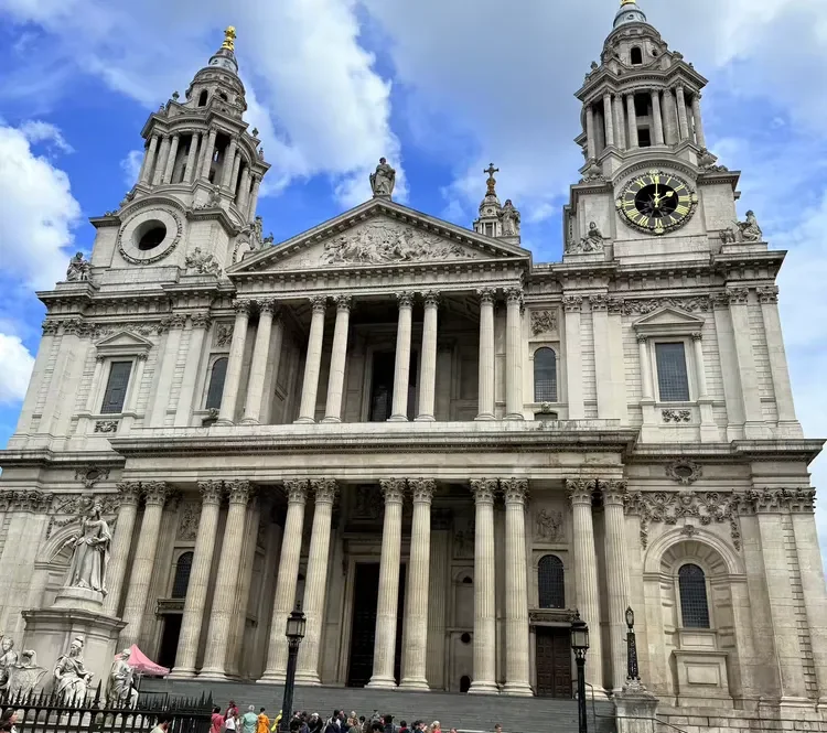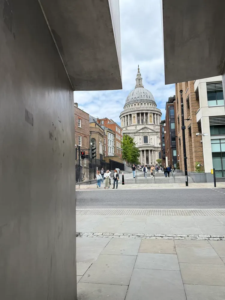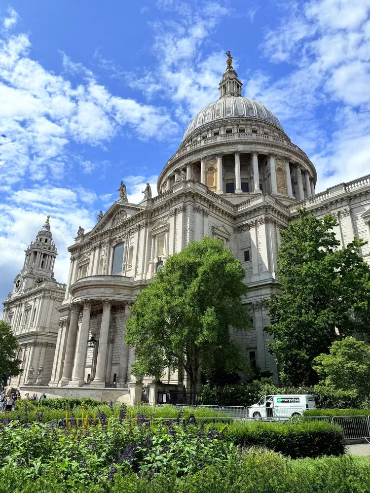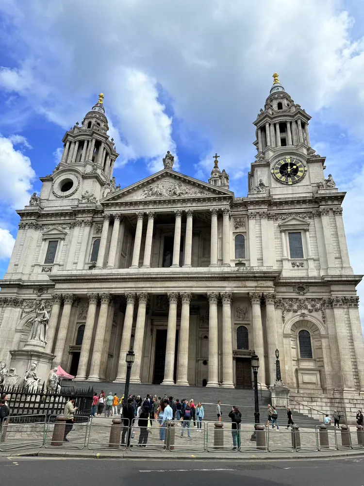 沿着小巷走着走着,圣保罗大教堂那标志性的巴洛克式圆顶便映入眼帘,如同一颗璀璨的明珠镶嵌在城市的天际线上。这座克里斯托弗·雷恩的杰作,在夏日的蓝天白云映衬下,显得格外的庄严而神圣。