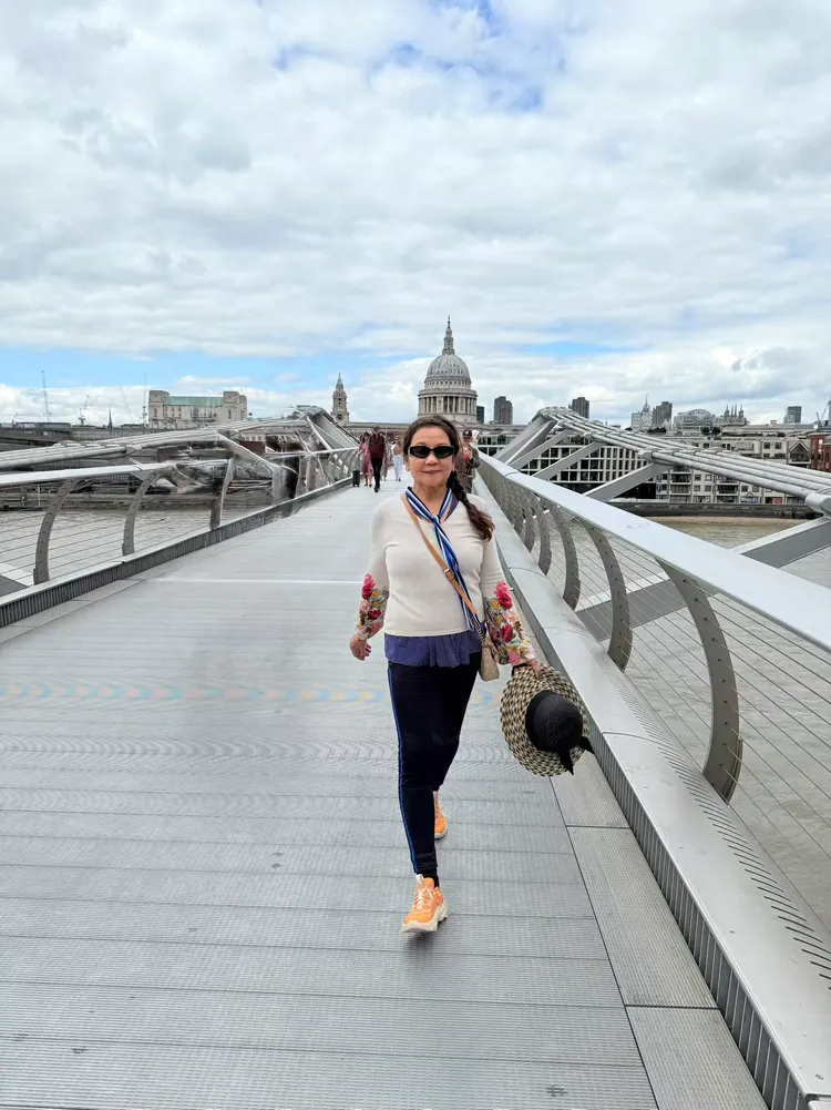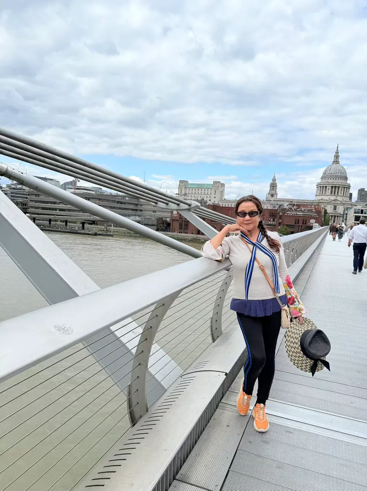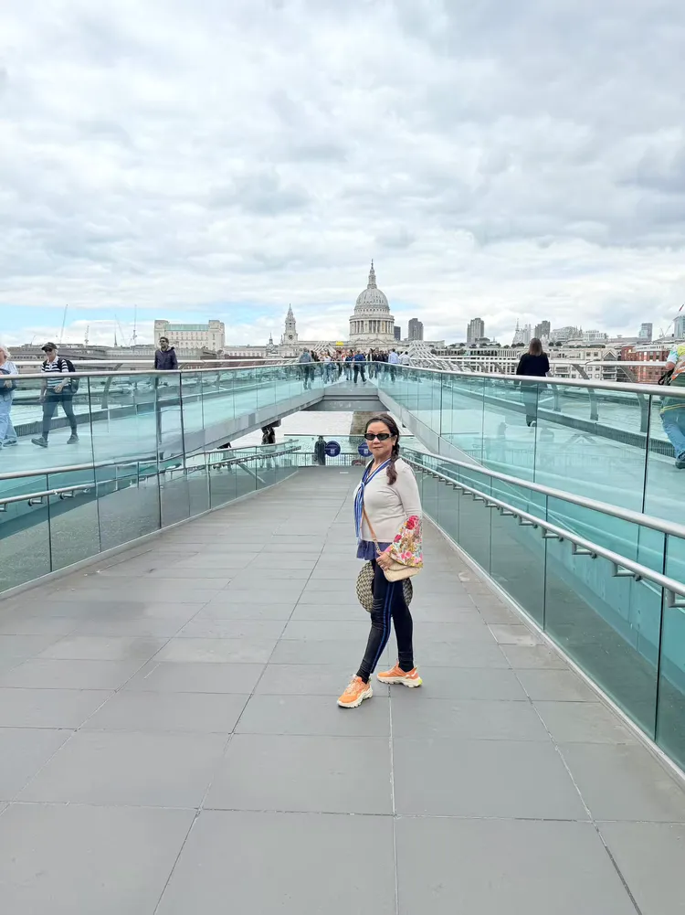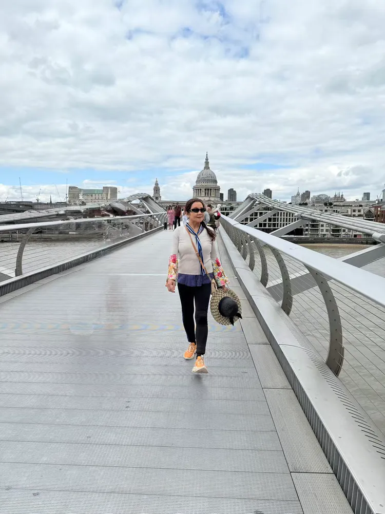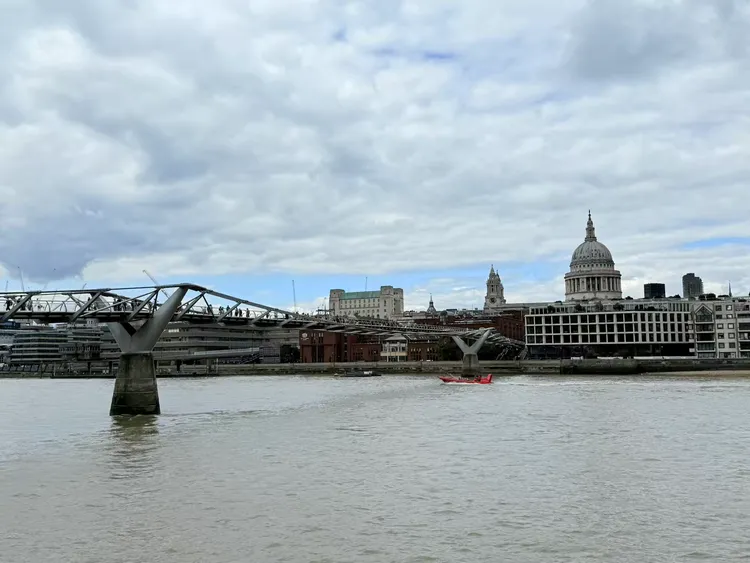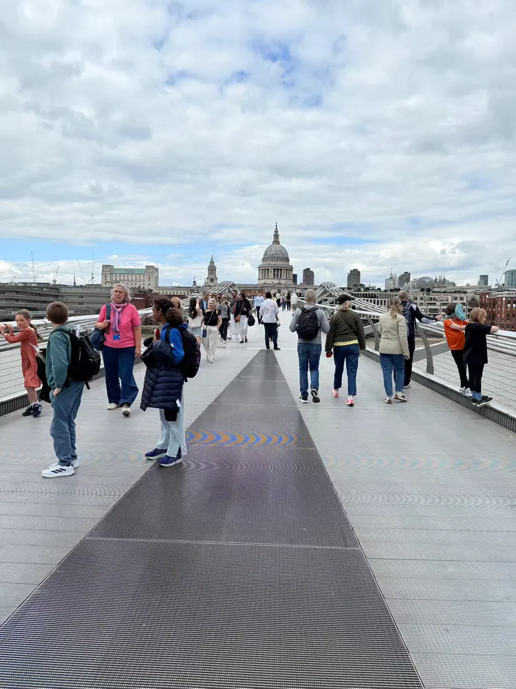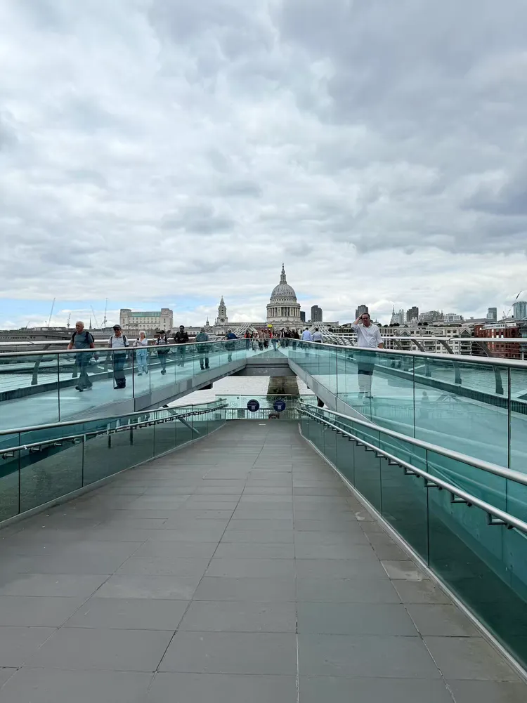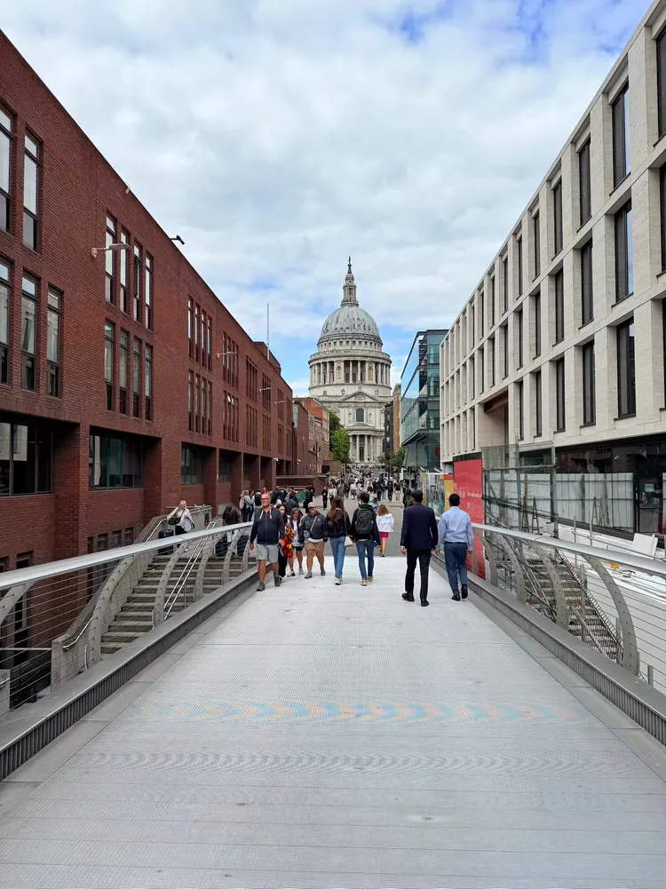 千禧桥就在眼前,这座由诺曼·福斯特设计的悬索桥,以其简洁而优雅的线条令人印象深刻。没有传统桥梁那样厚重的桥塔,取而代之的是纤细的钢索和流线型的桥身,整个设计透着一种轻盈的美感。
