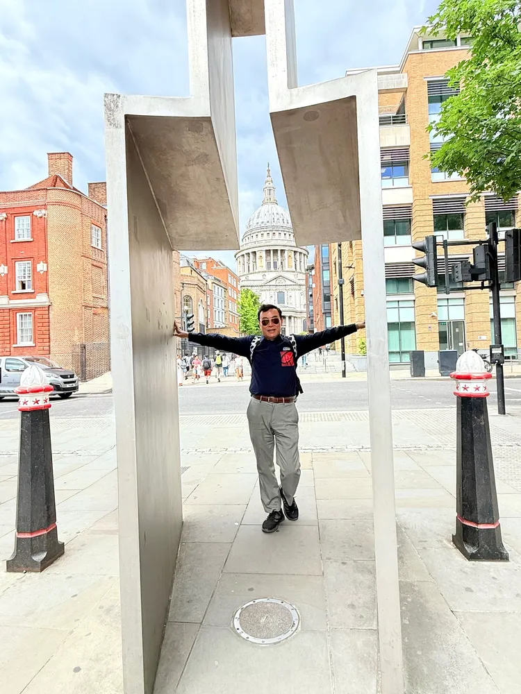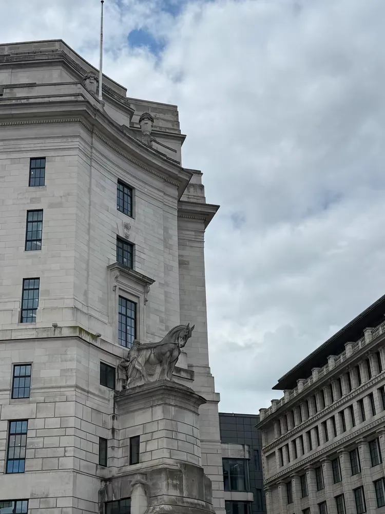 2025年7月7日,下午,风和日丽。我们离开了伦敦国家美术馆,乘坐地铁驶往圣保罗大教堂。伦敦的七月,阳光格外温柔。当我们走出地铁站,有一段古朴的小巷通往圣保罗大教堂,沿途有矗立在角楼的的骏马石雕、高悬在空中的斗鸡场招牌和镶嵌在商店门面玻璃上的彩灯“伦敦眼”转盘。