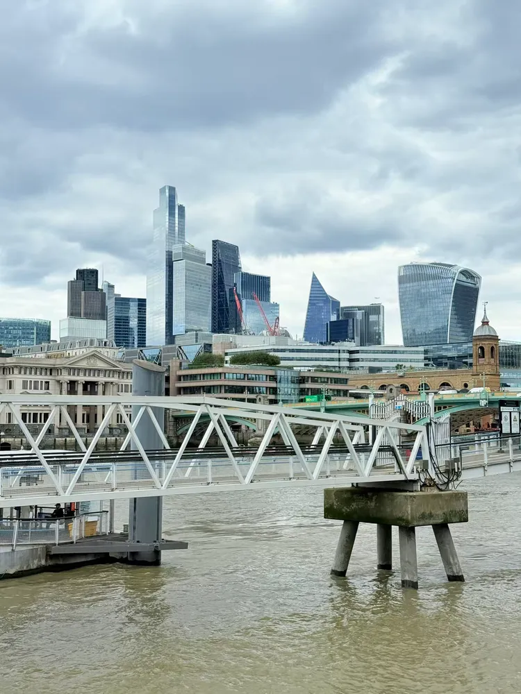 离开圣保罗大教堂,信步走向另一个伦敦的地标—千禧桥(Millennium Bridge)。当我们沿着泰晤士河北岸漫步,远远地就看见了那座横跨河面的现代艺术品—千禧桥。这座被伦敦人亲切地称为“摇摆桥”的步行桥,在午后的阳光下闪闪发光,如同一条银色的丝带连接着河流两岸的历史与现代。