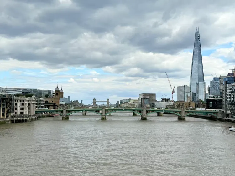 站在桥的中央,四周的景色美得令人屏息。向北望去,圣保罗大教堂的巴洛克式穹顶在蓝天白云的映衬下显得格外庄严。夏日的阳光洒在教堂的波特兰石材上,呈现出温暖的金黄色调,与现代化的金融城天际线形成了完美的对比。