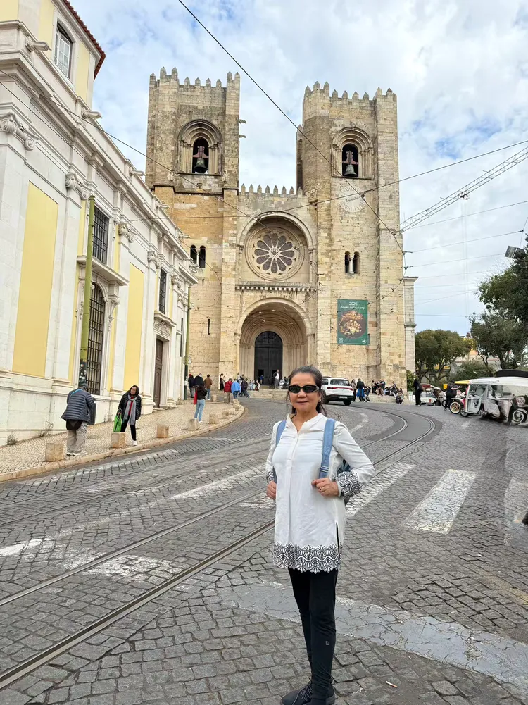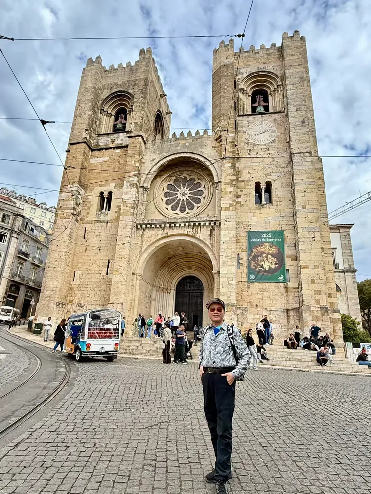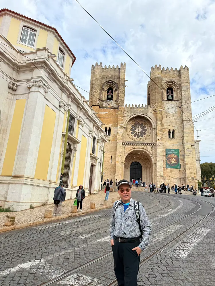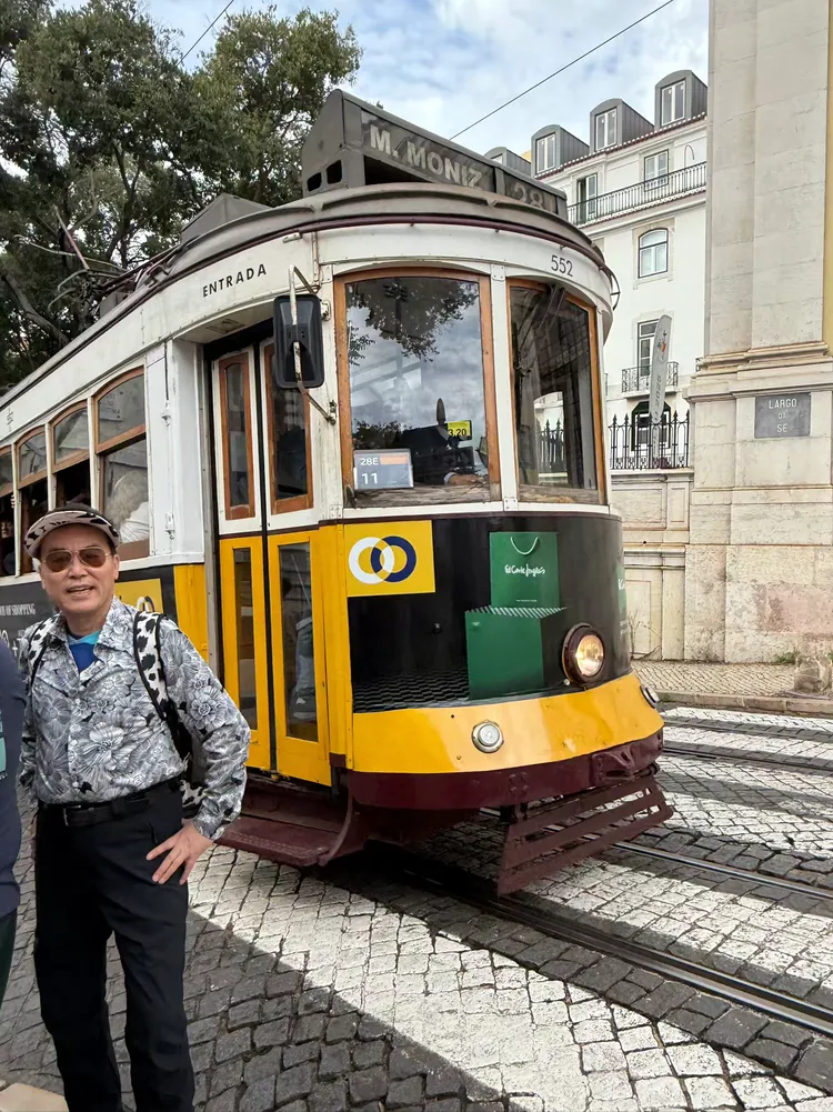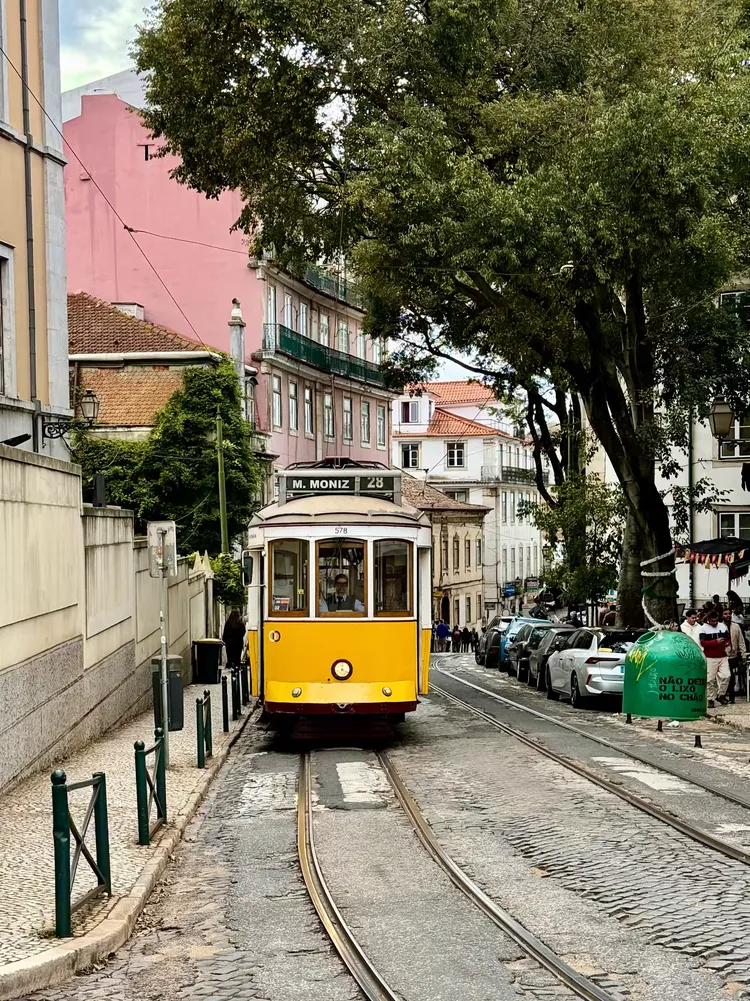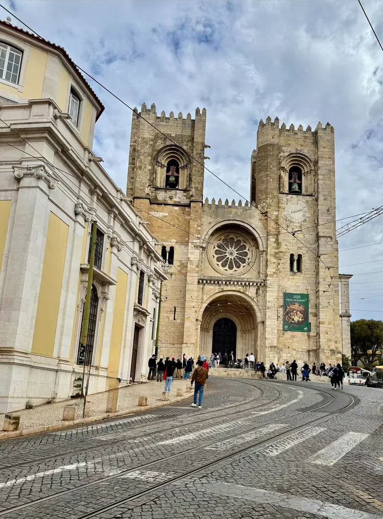 在阿尔法玛区行走过程中,途经里斯本的主教堂,这里是著名的复古黄色有轨电车的停靠站和转弯处。里斯本的28路复古有轨电车(Tram 28)是这座城市最具标志性的交通工具之一,也是游客必体验的项目。
