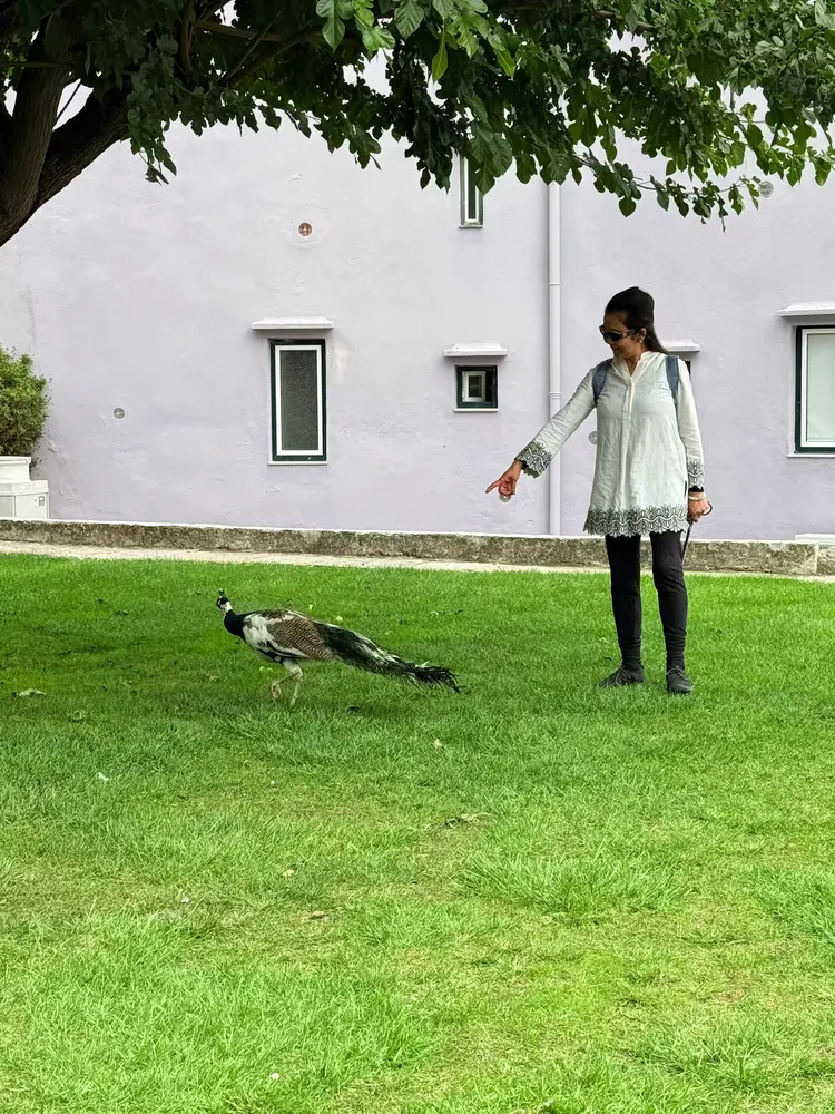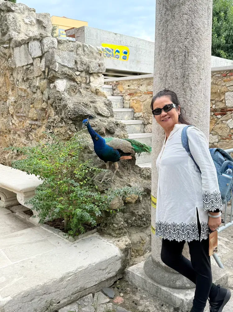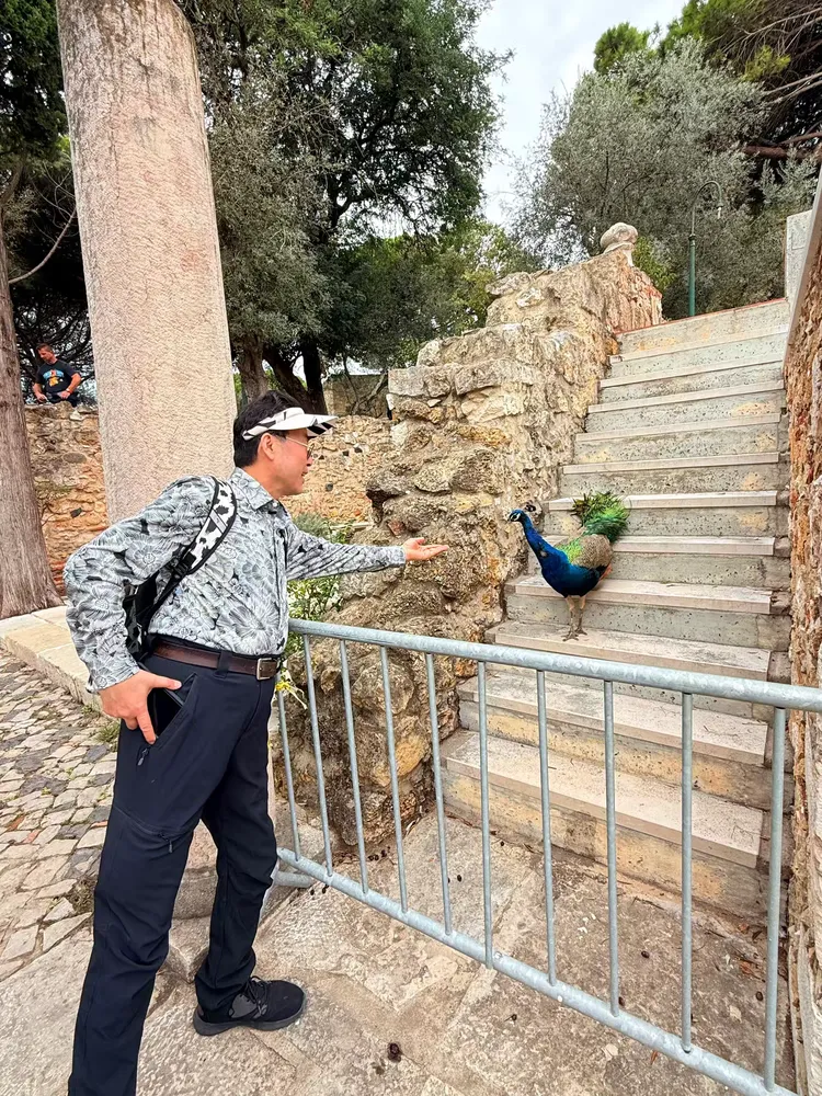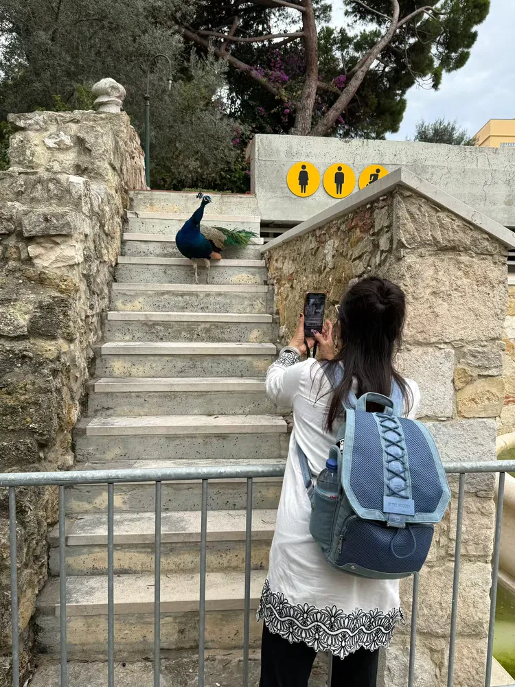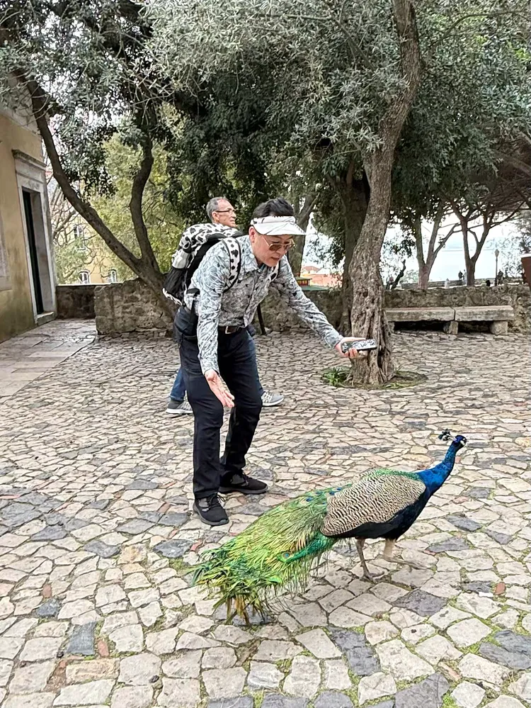 在草坪上,在石板路上,在石阶梯上,美丽孔雀的身影无处不在。它们丝毫不惧怕游人,甚至调皮地与游人互动交流,形成圣乔治城堡内一个独特有趣的风景线。