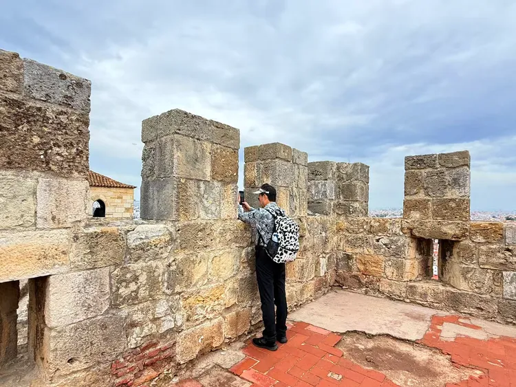 漫步在城墙上,可以从不同角度欣赏里斯本的全景,包括红瓦屋顶的老城区、特茹河以及远处的4月25日大桥。