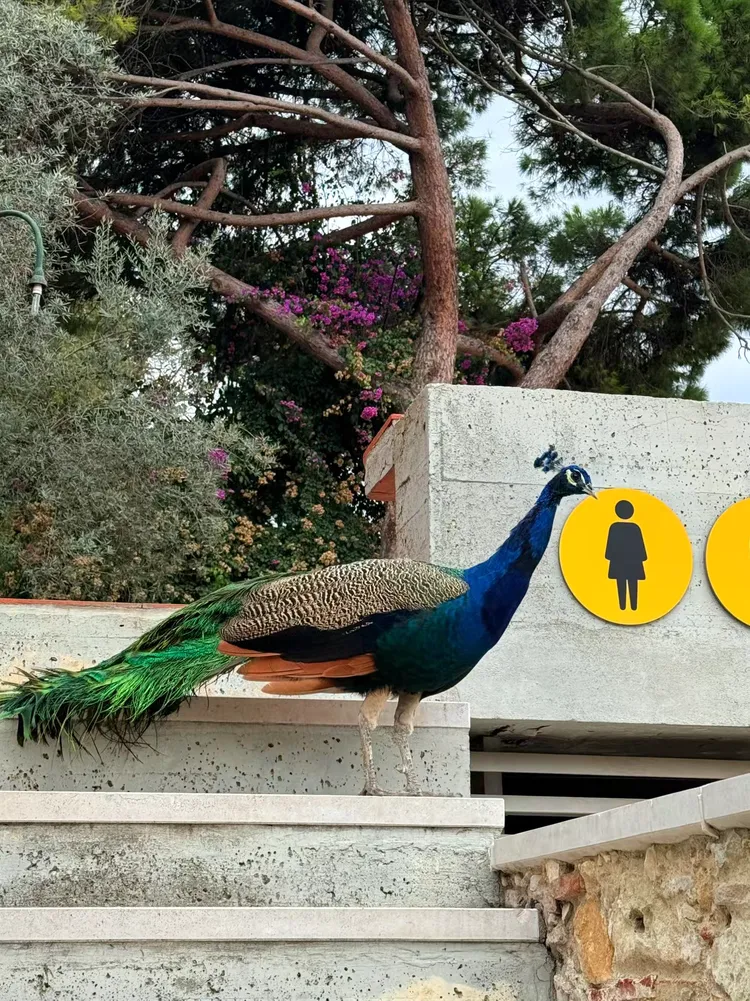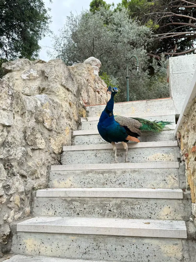 花园区域种植着松树、橄榄树等地中海植物,还有许多只孔雀在园中自由漫步,为这座古老的军事建筑增添了几分悠闲气息。