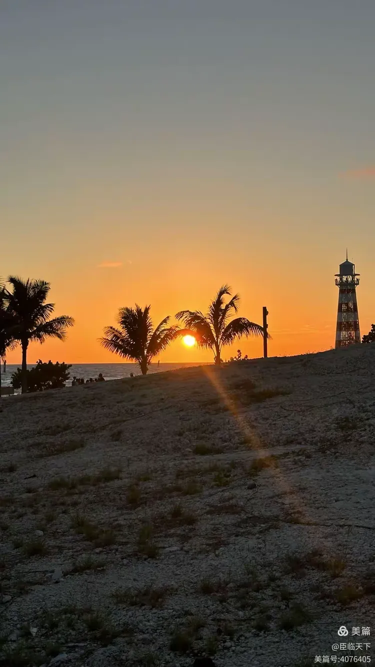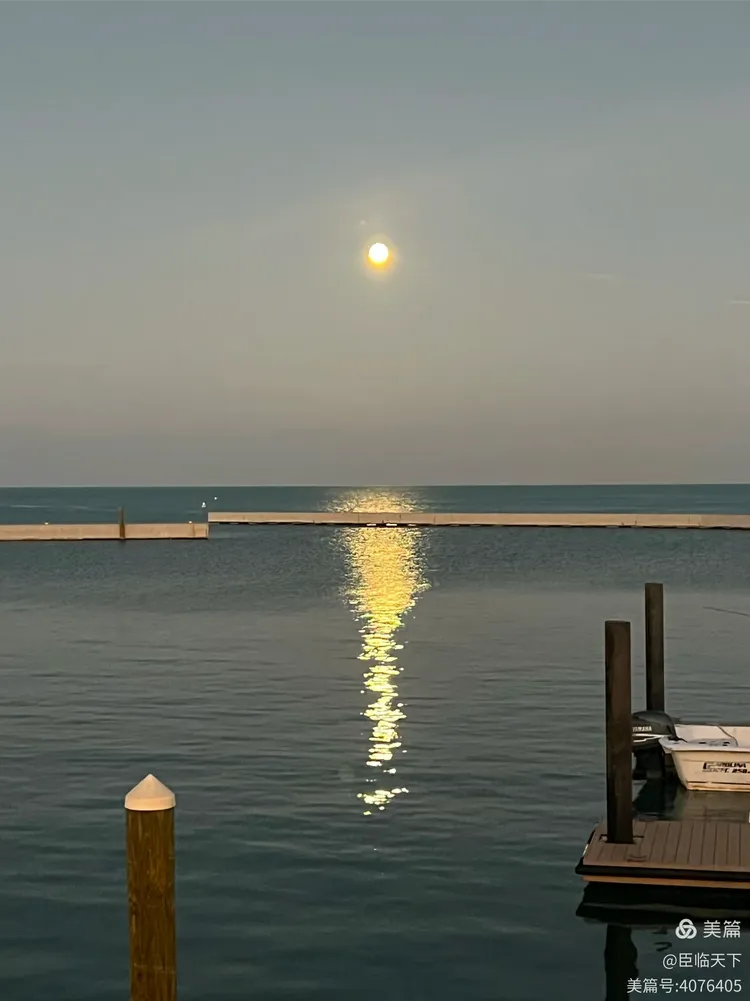 太阳渐渐地落下在海平线下,冉冉升起的月亮倒映在海面之上,海洋礁岛的灯塔上的灯光闪烁着耀眼的光芒,给整座小岛增添许多色彩与情趣。