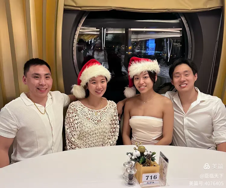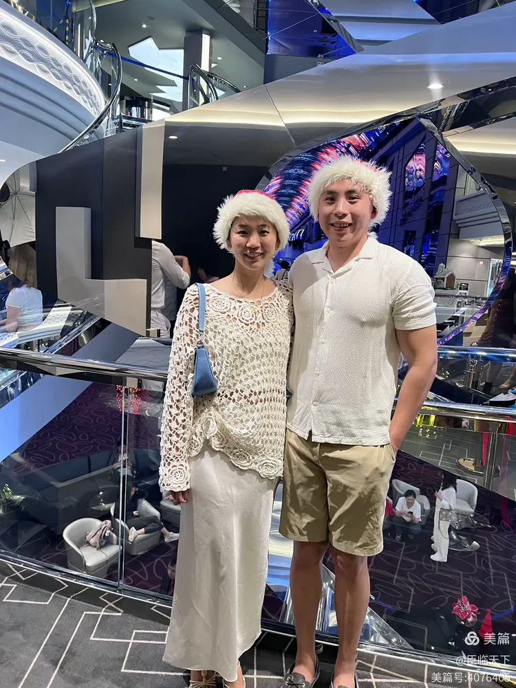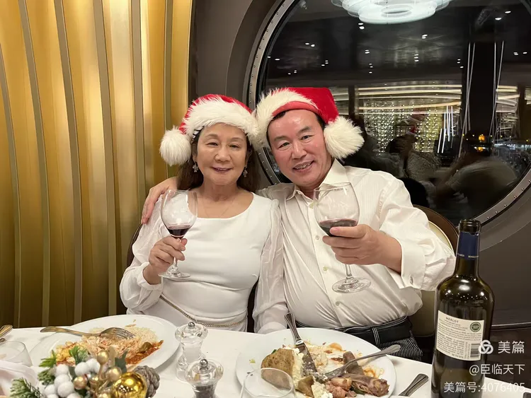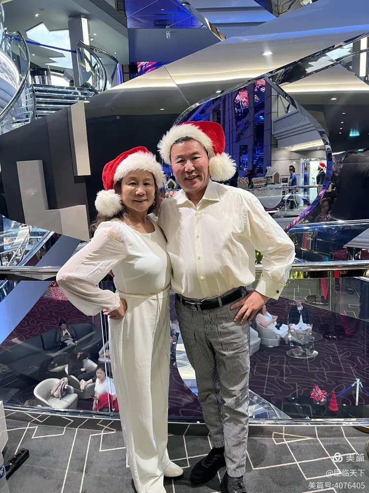 晚餐时间,按着游轮上的建议,我们换上了圣诞的白色服装,戴上红色的圣诞帽,兴高采烈地庆祝2023年的圣诞节。