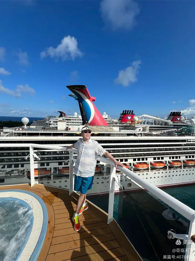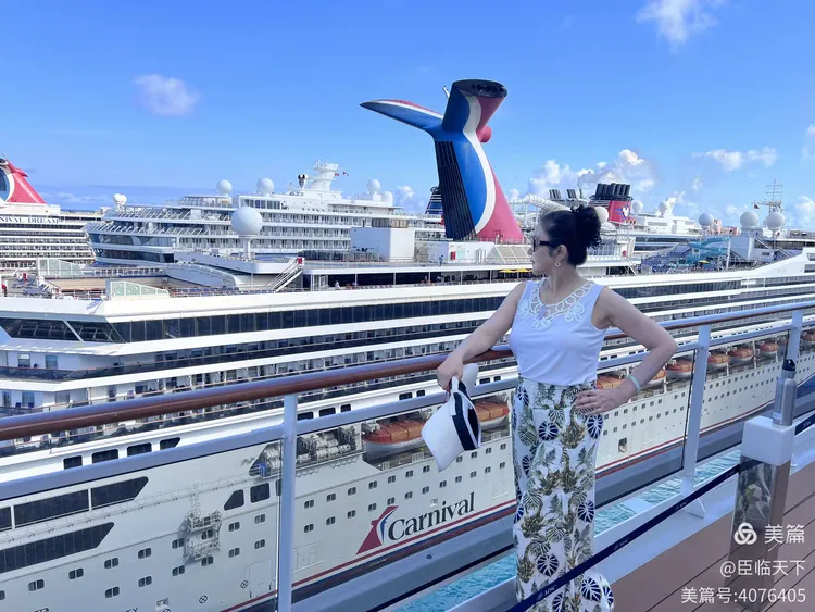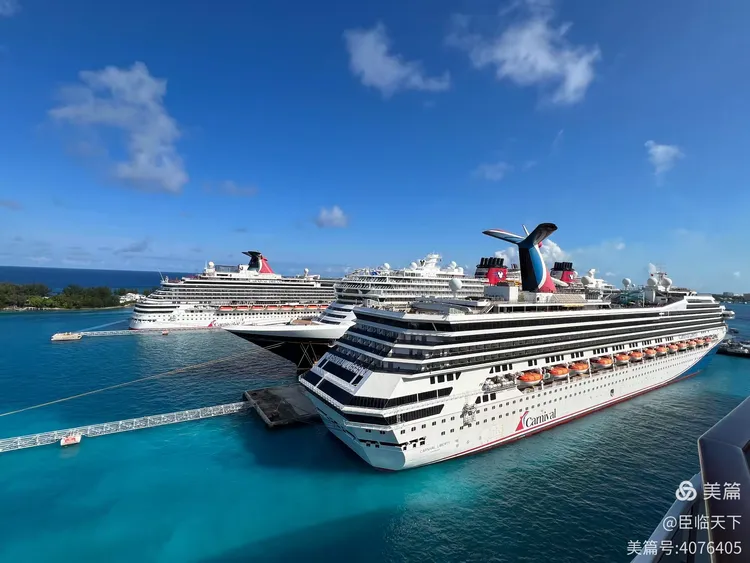 12月27日游轮停泊在巴拿马首府拿骚。港口已停泊了数艘其他旅游公司的游轮,两艘游轮造型别致,一看就知道是来自迪斯尼公司,米老鼠的标志清晰可见。