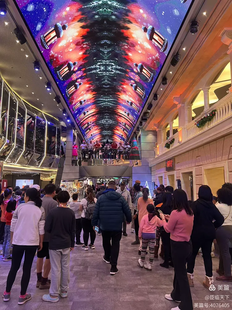 巨大的拱形屏幕就像一片高科技的数码化的天空,这个屏幕可以呈现出各种图像、模拟日出日落、云卷云舒、火山海啸、鸟语花香、宗教故事、节日气氛、奇异拼图……,并且可以在任何时间生成各种应景的天气和场景。 穹顶秀每天播放2-4场,绝不重复播放。