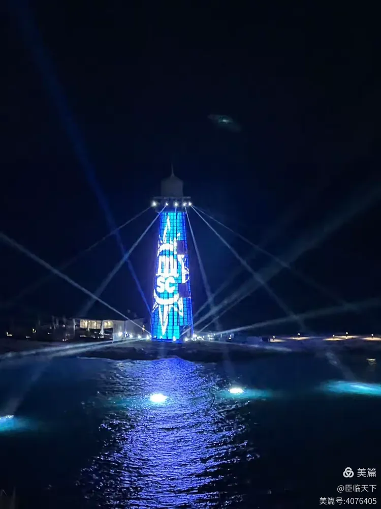 深夜在海湾中,岛上的灯塔在震天的音乐中射出了五彩缤纷的光芒,这是一场震撼心灵和视觉的彩色激光秀,将这次加勒比海之旅的主题推向了高潮。