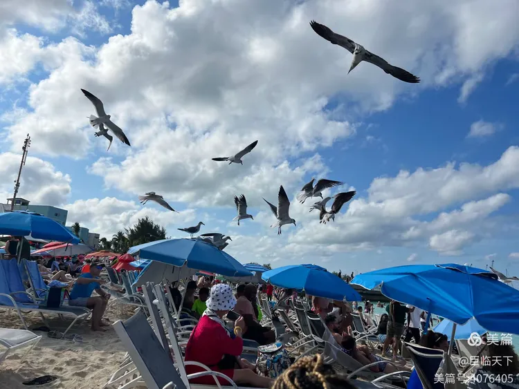 在拿骚的海滩上,万伞漂浮,一位难求。我们转了半个小时花了25美元才租到一个阳伞位。海鸟满天飞舞,海风轻轻吹拂,躺在巴哈马拿骚的白金沙滩上,尽情地享受着大自然的馈赠。